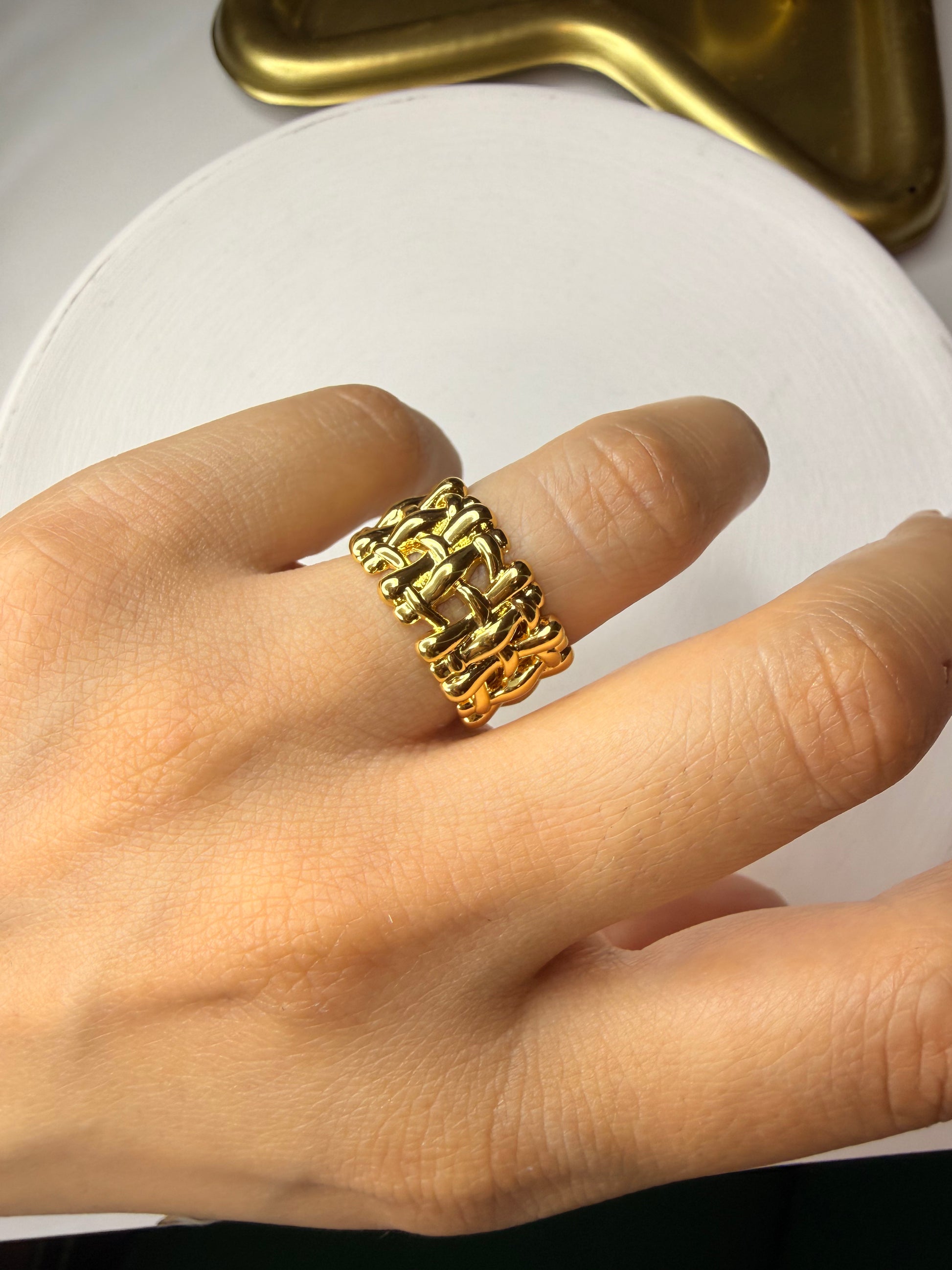 El Anillo Abstracto Dorado (Baño de Oro 18K) es una joya artística con curvas orgánicas que aportan un toque de distinción y estilo moderno.