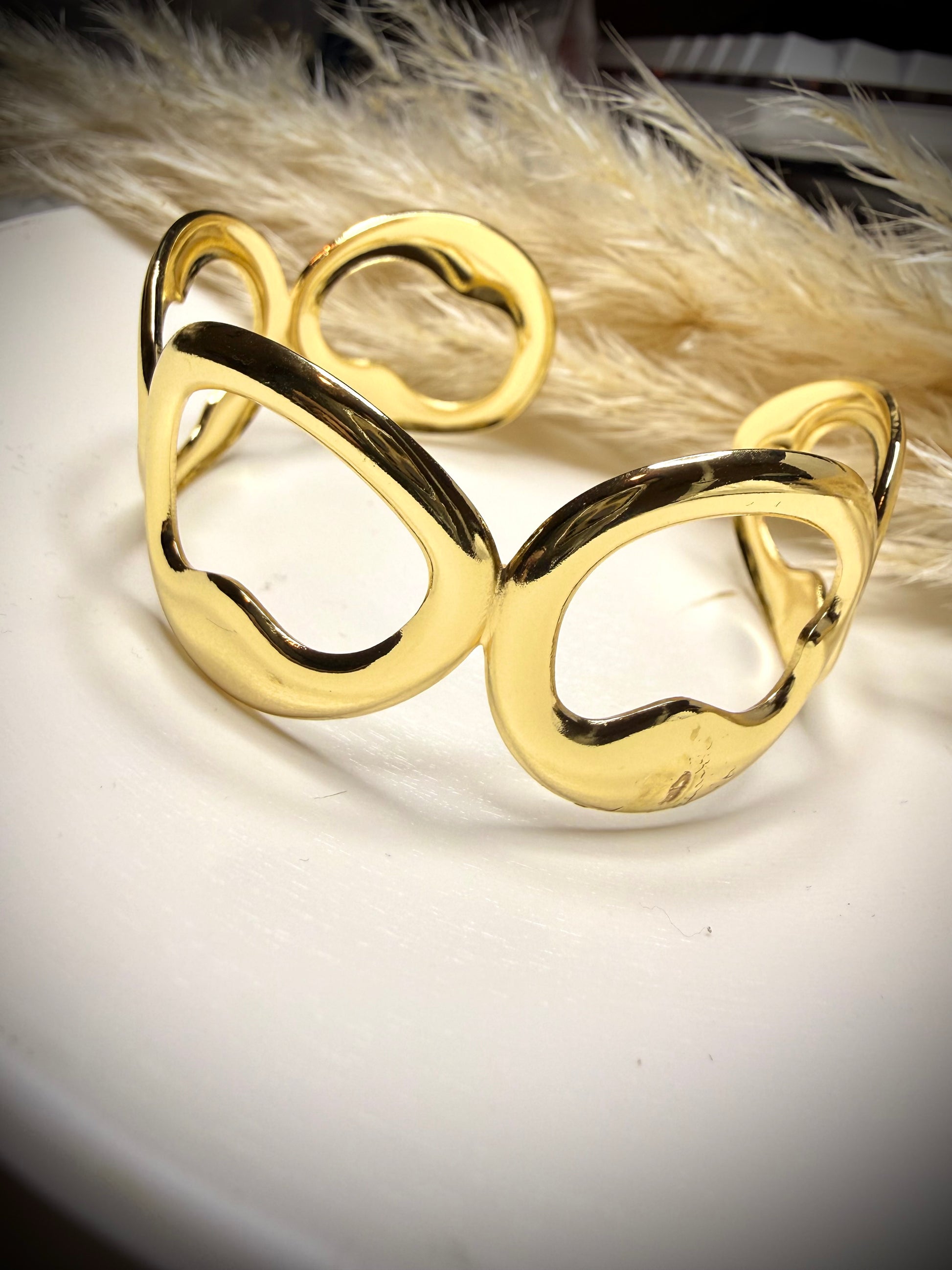 Brazalete de diseño fluido con ondas entrelazadas que evocan movimiento y sofisticación. Su acabado pulido en oro 18k refleja la luz con delicadeza, ideal para un look moderno y atemporal. Ajustable y cómodo para uso diario o de ocasión.