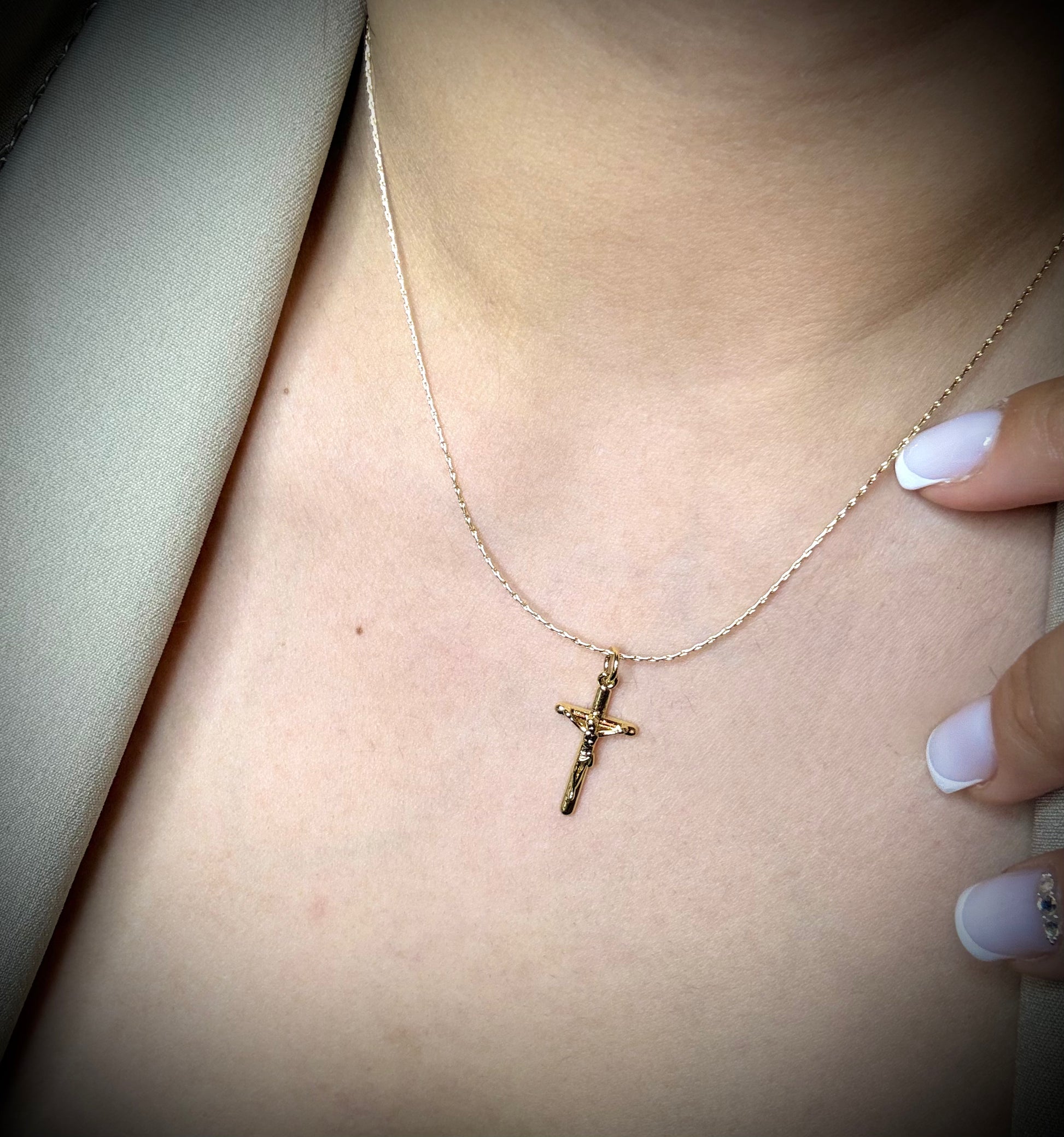 Collar con cruz lisa en baño de oro 18k, de estilo tradicional y elegante. Un símbolo de fe y protección ideal para usar a diario.