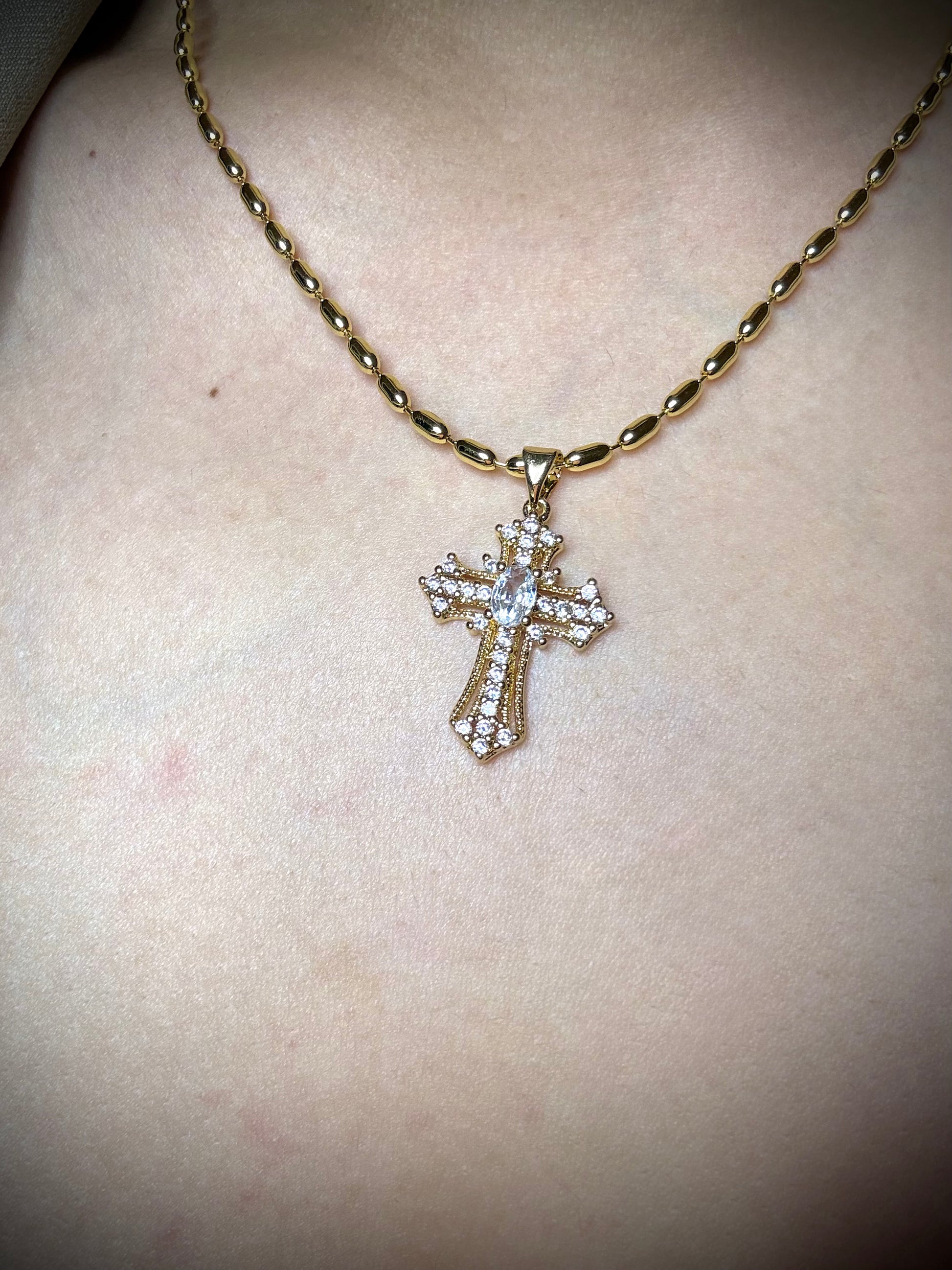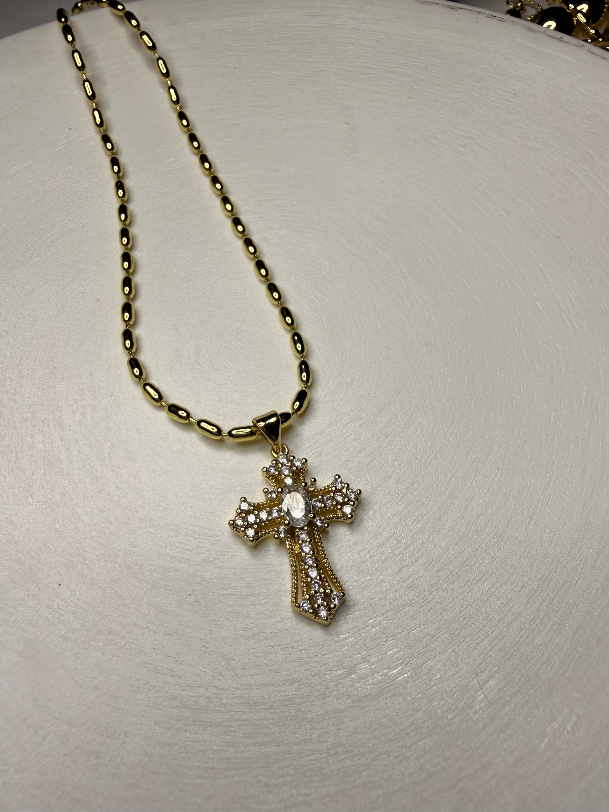 Collar de cruz con un diseño más elaborado y central en forma ovalada brillante. Una joya elegante y sofisticada.