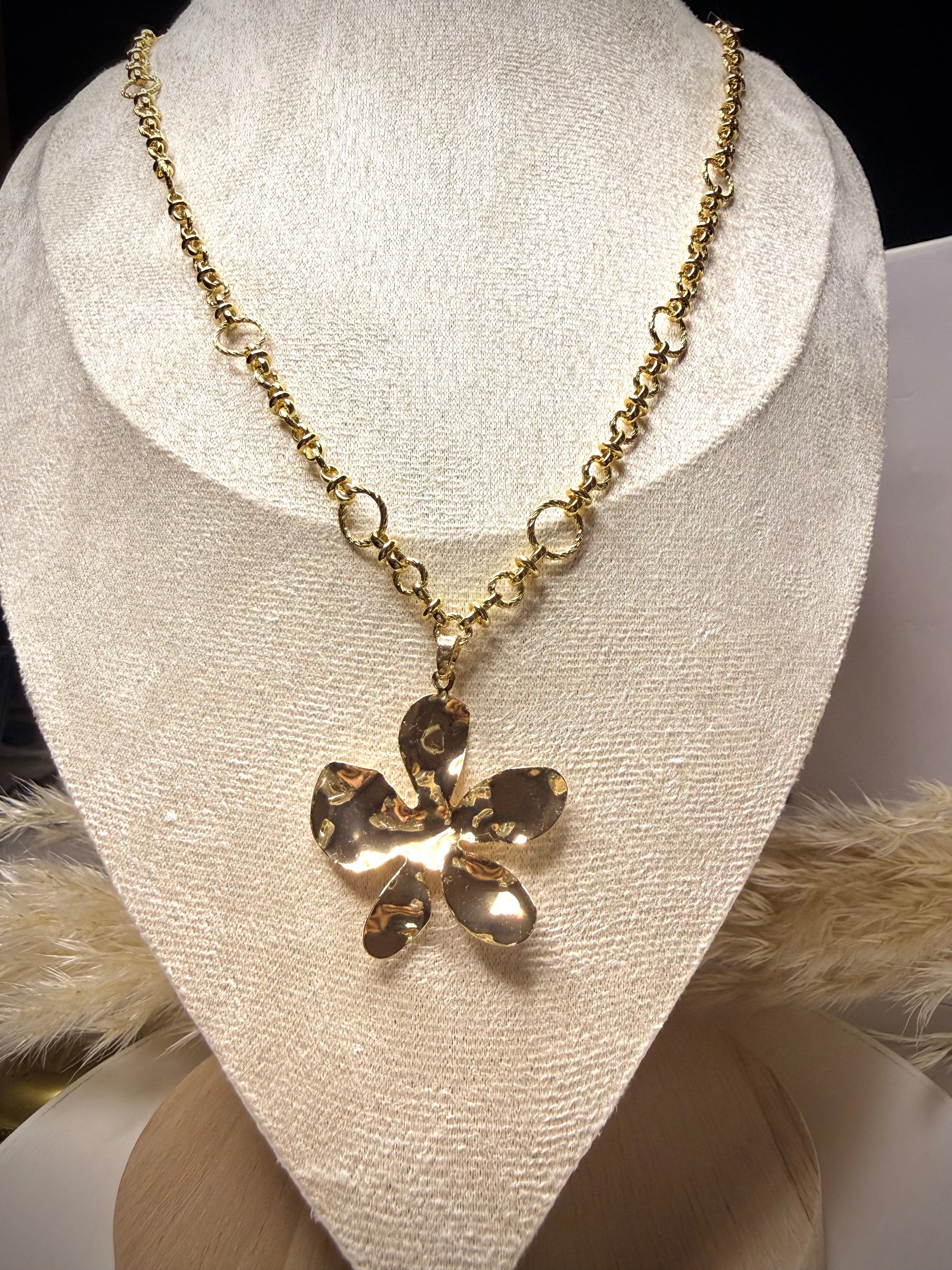 Cadena de eslabones redondeados con dije de flor de pétalos metálicos. Una pieza artística y moderna, perfecta para quienes buscan destacar con elegancia.
