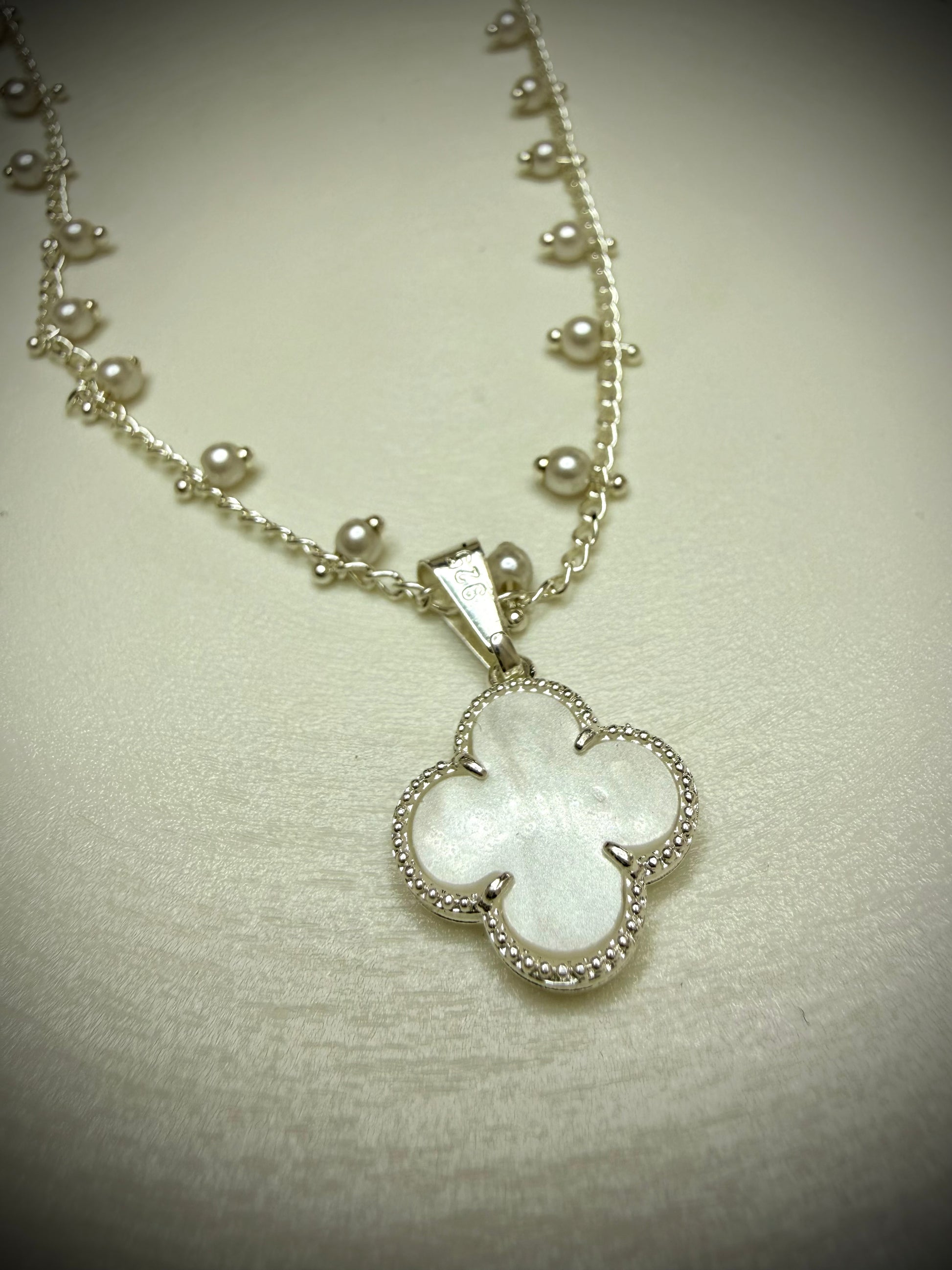 Cadena decorada con pequeñas perlas naturales que enmarcan un dije en forma de trébol de nácar blanco. Una joya que representa pureza y elegancia atemporal, perfecta para un estilo refinado.
