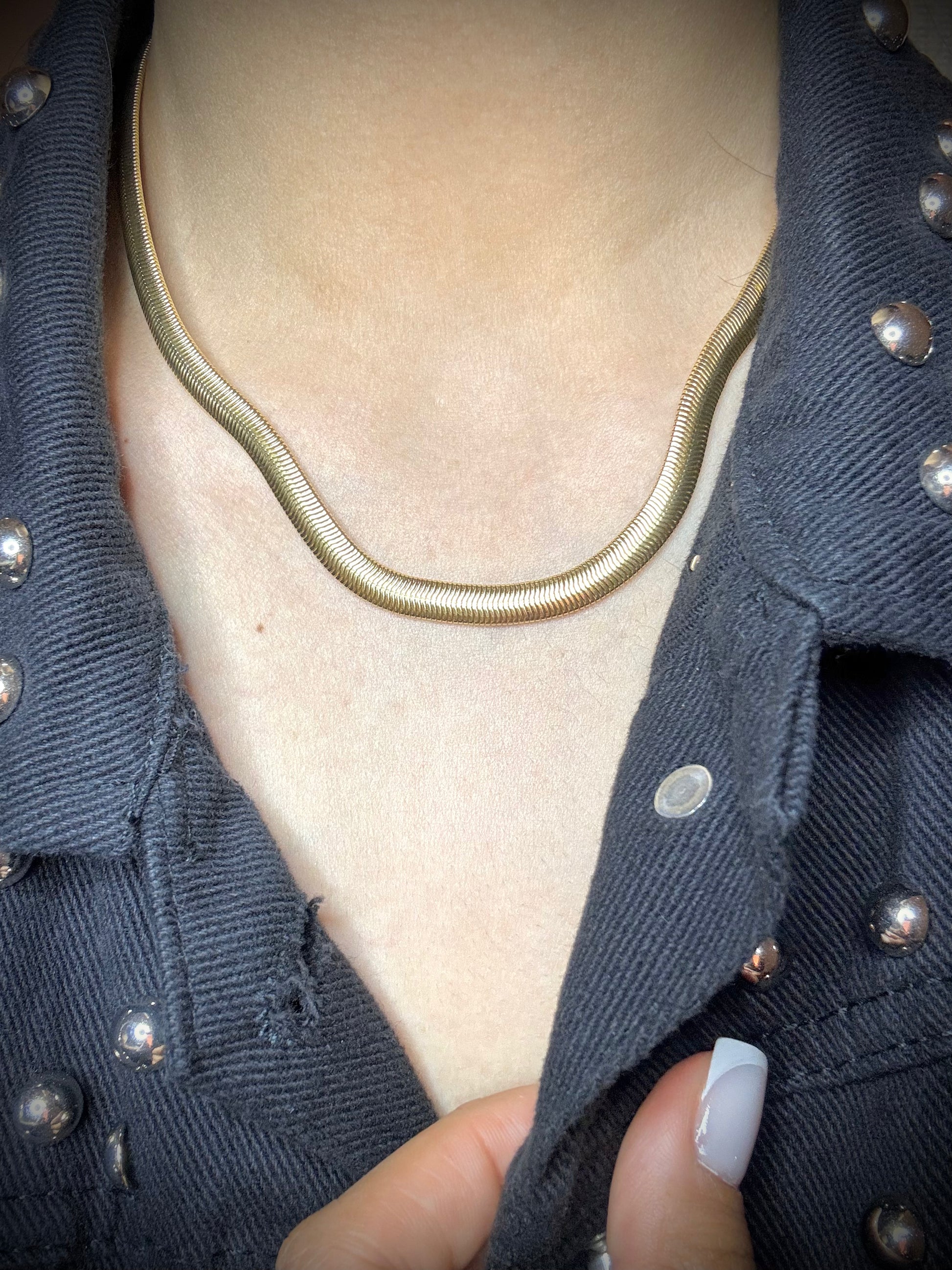 Collar tipo “snake” bañado en oro 18k, con un diseño elegante, firme y lleno de estilo. Ideal para destacar cualquier look, ya sea solo o acompañado de otras cadenas.
