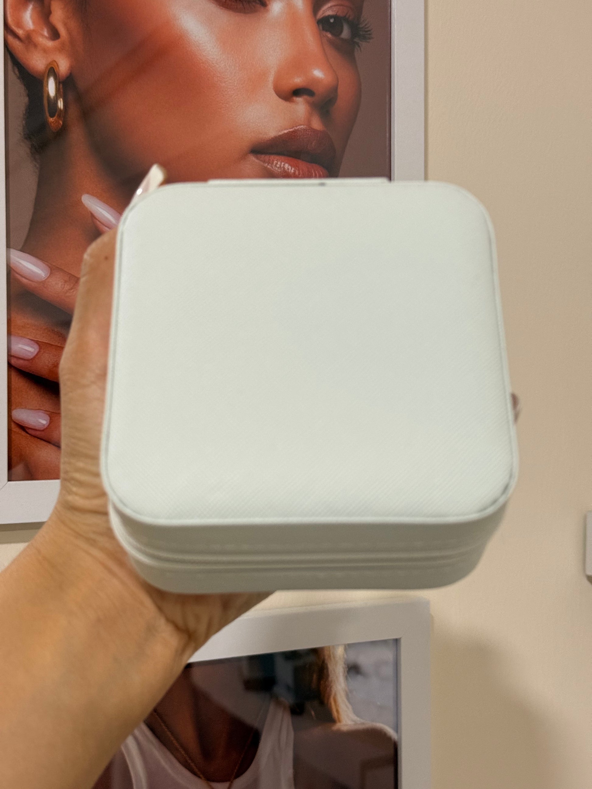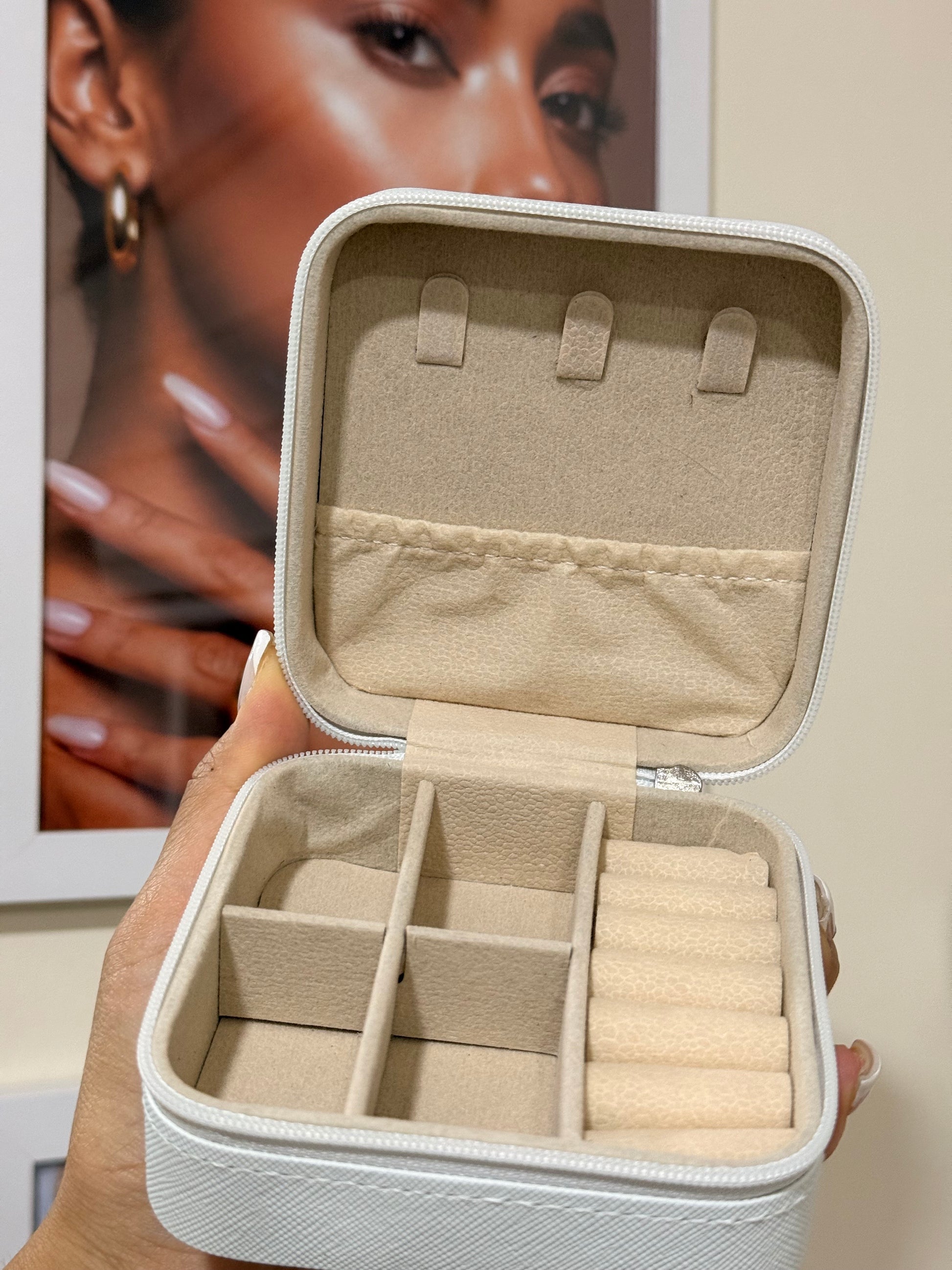 Joyero en tono blanco perlado, limpio y sofisticado, ideal para mantener tus joyas ordenadas y seguras.