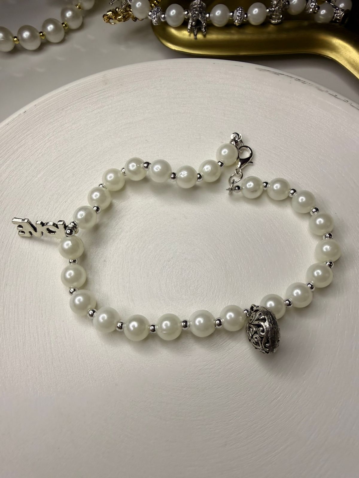 Un diseño lleno de ternura con un dije de corazón y mini bolitas plateadas.