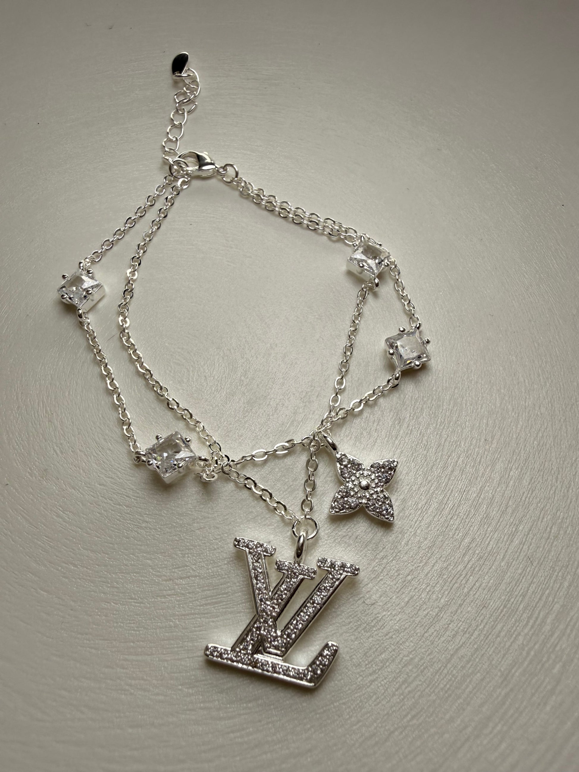 Pulsera doble con dijes inspirados en el lujo: estrella y emblema inicial, ambos incrustados con circones. Elaborada en Plata 925 con cadena delicada y cierre mosquetón.