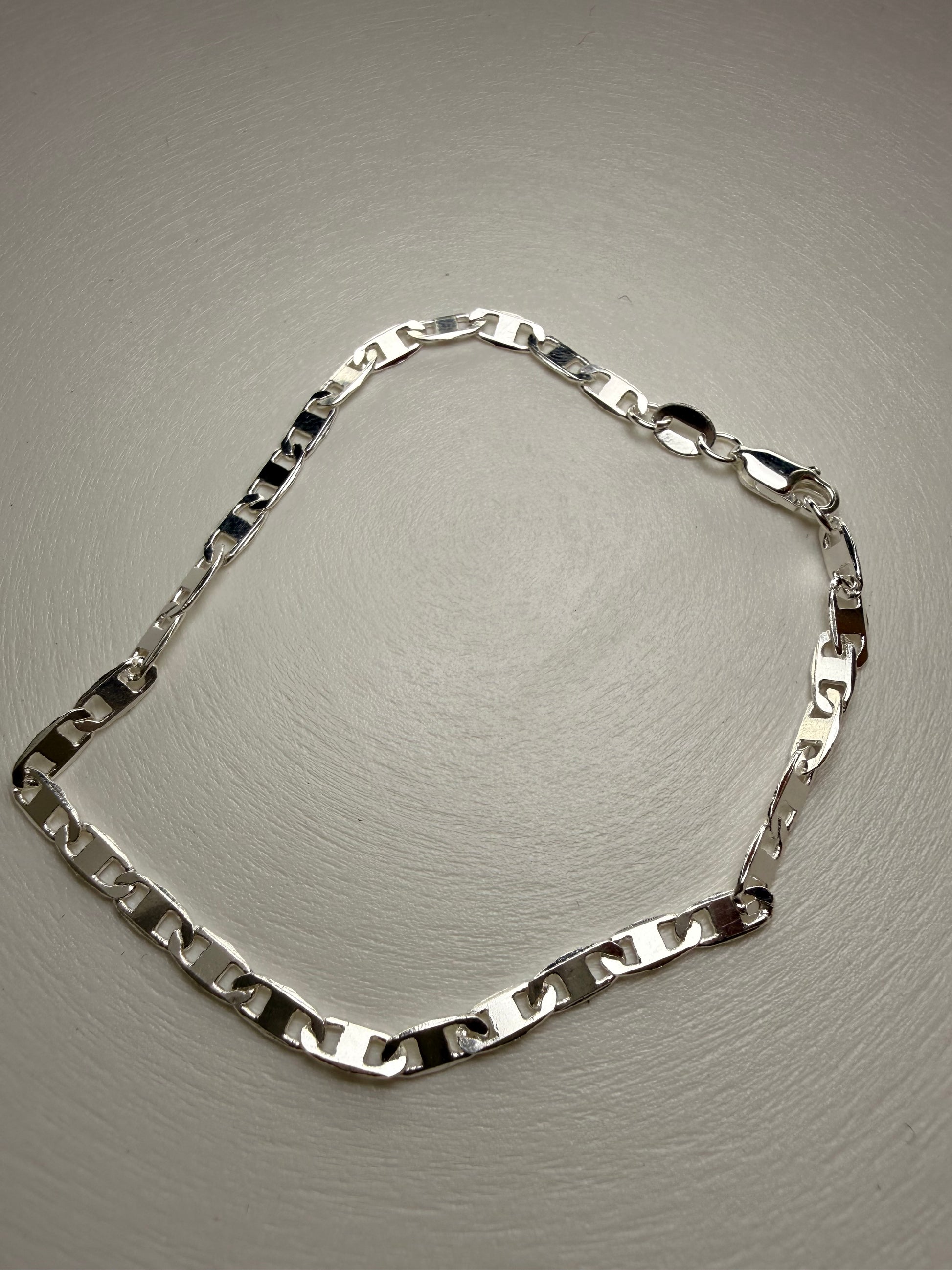Diseño de eslabones planos entrelazados, inspirados en el estilo italiano. Elaborada en Plata 925 con terminación brillante espejo. Una pieza versátil que combina fuerza y sofisticación.