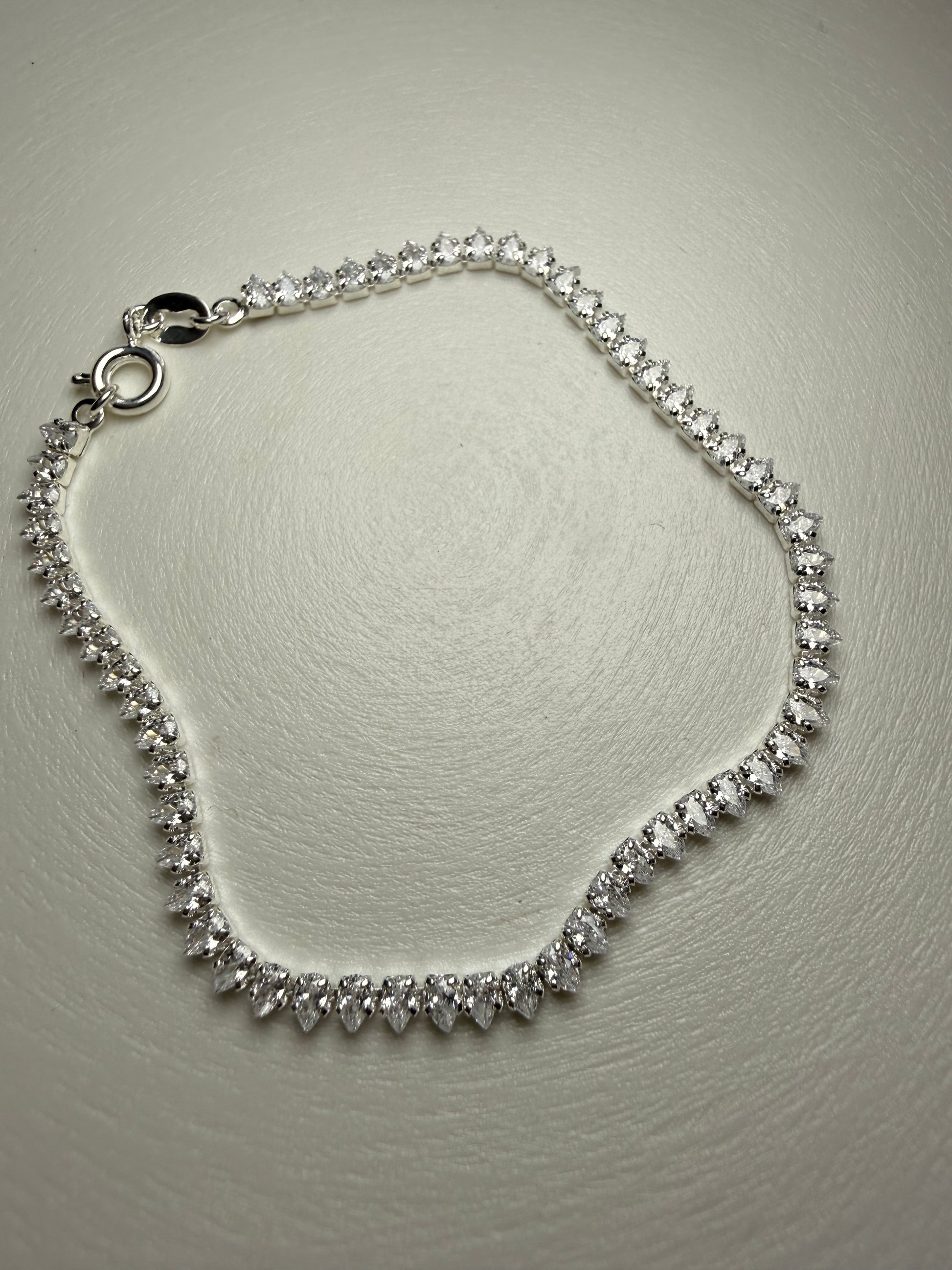 Pulsera tipo tennis con circones en corte gota montados sobre base de Plata 925. Su brillo en diferentes ángulos la hace única y elegante.